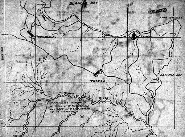 At the lower center is an X with "approximate location of crash of Lt. and crew in B-25C 04° - 298' S 152° 16' E.". Also indicated is Blanche Bay, Cape Gazelle, Kabanga Bay, Warangoi River, Vunakanau Airfield, Tobera Airfield and Rapopo Airfield on eastern New Britain. Credit: MACR 1788 page 9 Date: January 20, 1944