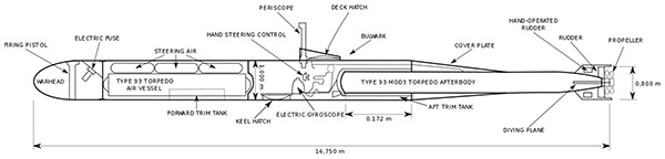 Indicated is the warhead, firing pistol, electric fuse, Type 93 torpedo air vessel, steering air, forward trim tank, keel hatch, electric gyroscope, hand staring controls, periscope, deck hatch, aft trim tank, type 93 mod 3 torpedo afterbody, cover plate, diving plane, hand operated rudder, rudder and propeller. Length 14.75m height .8m